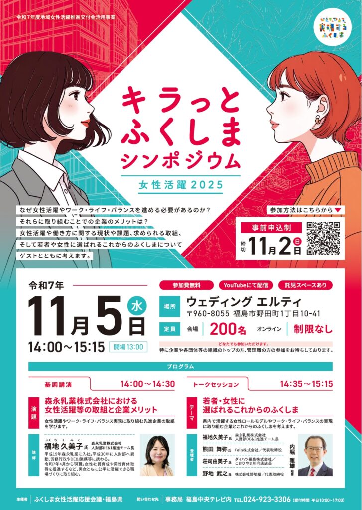 シンポジウムでは、先進的な取組を行っておられる森永乳業様から「森永乳業株式会社における女性活躍等の取組と企業メリット」についてご講演いただくほか、「若者・女性に選ばれるこれからのふくしま」をテーマに県内で活躍する女性ロールモデルの方や知事を交えたトークセッションを行います。