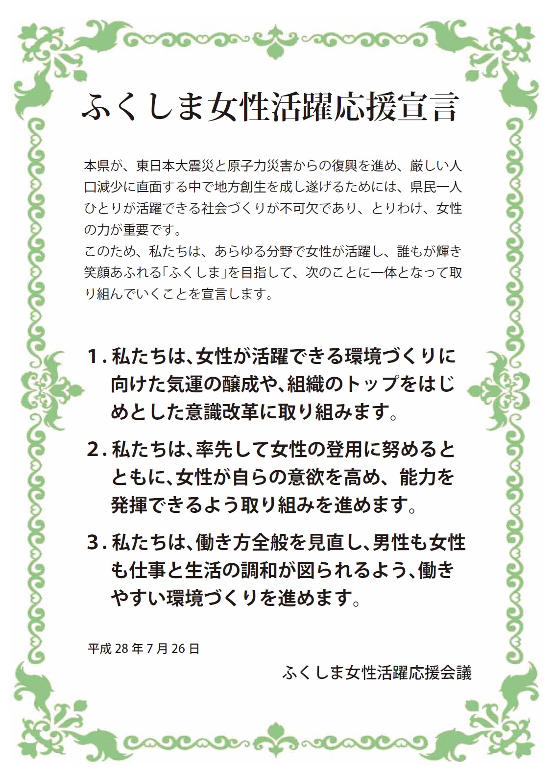 県内各種団体が官民一体となって、女性が活躍できる環境づくりを一層進めるため、「ふくしま女性活躍応援会議」を立ち上げ、女性活躍推進に関する取組や課題などについて意見を取り交わしました。 会議終了後の「ふくしま女性活躍応援 […]