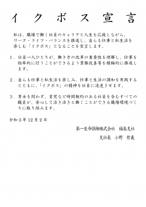 月に1回の一斉15時退社日「ブルースカイデー」や、週に1回のテレワーク推奨日設定など、ワークライフバランスの実現に向けた各種取り組みも拡大しています。コロナ禍で加速したチャットボットなどAI活用による業務省力化であったり、リモートワークの普及は、女性活躍の追い風です。エリア職ならではの地域に根ざした発想を活かして、お客さま・地域社会に寄り添い、将来世代のwell-being(幸せ)の実現を目指す会社の将来像につなげていきたいと思います。