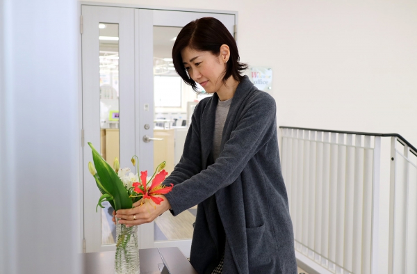 「おもてなし活動」では、デジタルサイネージを使ったウエルカムボードを設置したり、華道の師範を持つ社員が花を生けることで、CS(顧客満足)にもつなげています。社員から募集した「安全運転標語」をカードにして、営業車を運転する社員に配布するのも『Fなでしこ』の活動の一つです。