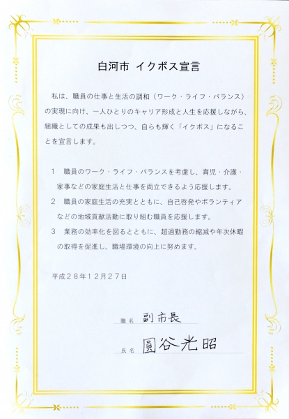 2016年12月1日に、白河市長が県内の他市町村に先駆け「イクボス宣言」をしました。イクボスとは、職場で共に働く部下、スタッフのワーク・ライフ・バランスを考えて、その人のキャリアと人生を応援しながら、組織の業績の結果も出しつつ自らも仕事と私生活を楽しめる上司のことです。この宣言を行うことにより、市職員の意識改革を図り、職員が安心して育児や介護ができる環境の整備や、職員のワーク・ライフ・バランスを応援して、「いきいきとした働き方」を目指します。その背景には、市職員の超過勤務解消という課題もあります。東日本大震災以降、復旧関係の事務で時間外労働が相当増え、ひと段落してからも常態化が続いてきました。