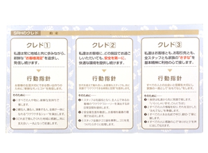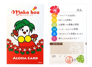 例えば、他の見本となるような接客をしたスタッフには、管理職が「今の対応は素敵でした」というコメントを書いた「アロハカード」を渡しています。このカードを受け取ったスタッフはネームカードに印が付き、枚数によって表彰されるので業務に取り組むモチベーションの向上にもつなげられていますし、あわせて管理職が部下の仕事ぶりをしっかり見ていくためのツールにもなっています。また、難易度の高い研修を受けた人やトレーナーはネームカードに特別な印をつけていますので、普段の業務中にもトレーニングを意識付けすることができています。