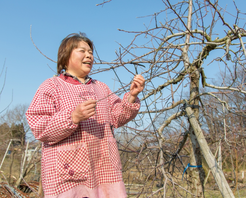 私が夫と結婚した昭和55年(1980年)頃は、農業の転換期でした。養蚕が下火になり、夫はヨーロッパで学んできた果樹栽培に未来を託しましたが、当然、果樹は、苗木を植えて数年は実りません。果物が実る日を心待ちにしながら、夫婦で木を大切に育ててきました。私から見ると、夫は「職人気質」で「働き者」。研究肌ともいえるかもしれません。よりよい作物を作ろうと、一生懸命手探りで取り組み続け、数年後には胸を張って自慢できるリンゴやモモが出荷できるようになりました。